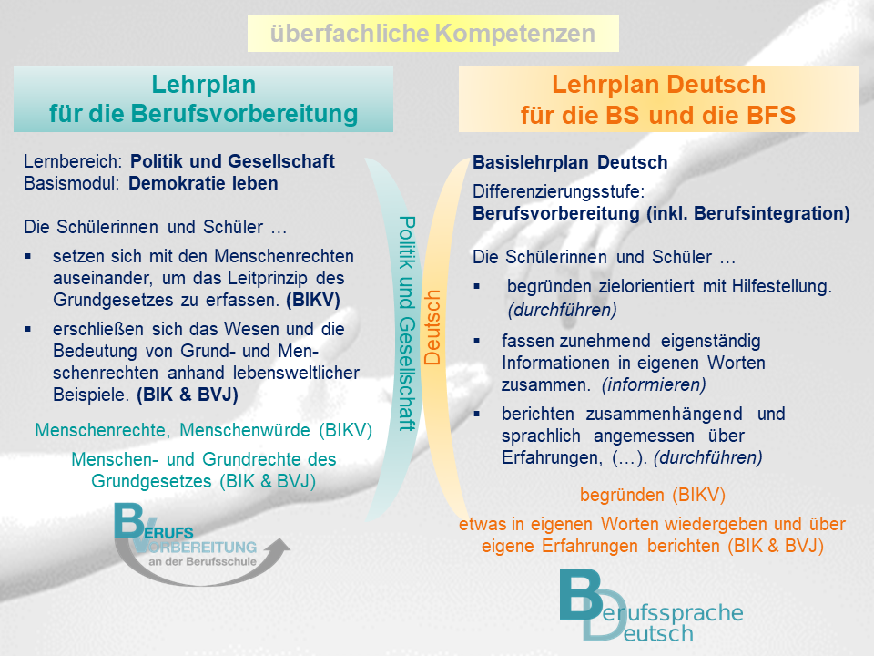 Die Schülerinnen und Schüler erweitern in der Berufsintegrationsklasse (BIK) ihre sprachlich-kommunikativen Kompetenzen hin zur fortgeschrittenen Sprachverwendung in Alltag, Schule und Beruf (vgl. B1 nach dem GER).