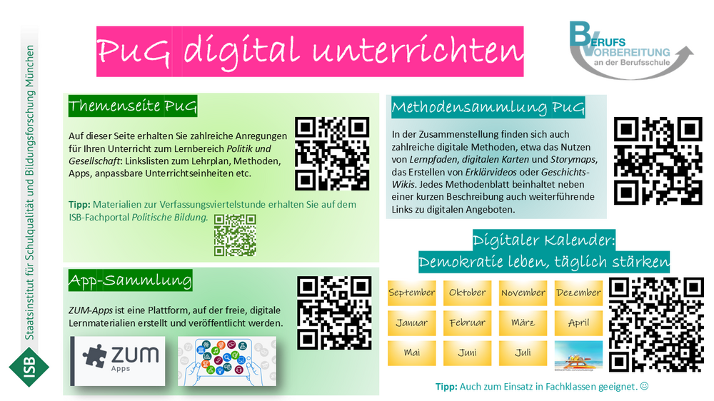 Jeden Monat erhalten Sie unterschiedliche Unterrichtsideen zur Demokratie- und Wertebildung in den Klassen zur Berufsvorbereitung (DK-BS, BIKV, BIK, BVJ, BVJ Neustart). Veränderbare Lerneinheiten, sprachsensible Methoden, digitale Anwendungen wie Apps oder Onlinespiele, konkrete Aufgabenimpulse mit Differenzierungsmöglichkeiten und viele weitere Anregungen sollen Ihnen helfen, die Querschnittsaufgabe Persönlichkeits-, Demokratie- und Wertebildung in den Klassen zur Berufsvorbereitung zur verwirklichen. Die Unterrichtsmaterialien eignen sich auch zur Umsetzung der Verfassungsviertelstunde.